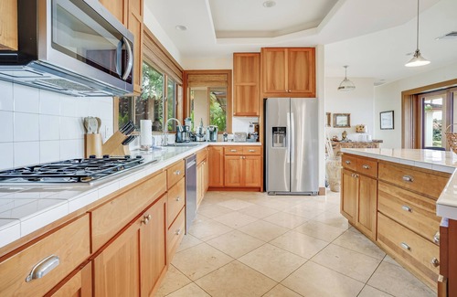 Perched on four lush acres in Launiupoko, this gated estate blends the comfort of a secluded retreat with the feel of a boutique resort. Outside, ocean views stretch toward Moloka’i and Lana’i on the horizon. The main house sleeps 7 across three ensuite bedrooms (plus a bonus child’s room), and the detached 2BR cottage adds space and privacy for your crew. Espresso maker in the kitchen, hammock in the yard, and 30,000 sq ft of fresh fruit trees outside.
