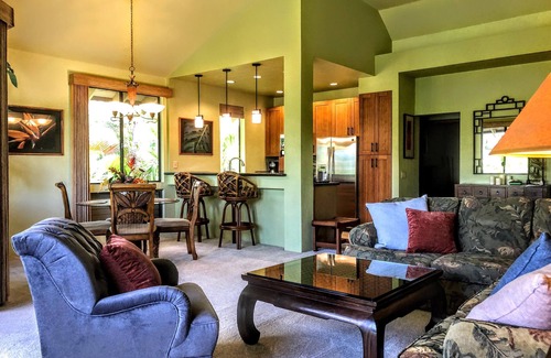 Nestled between the Wailea Blue golf course and the Wailea Tennis Club, amenities abound for your stay in Grand Champions Villas in Wailea. Very spacious and meticulously updated, our 1 bedroom, 2 full-bath top floor condo overlooks the resort style "serenity pool" for adults, with garden and peek-a-boo ocean views. The spacious lanai is perfect for your morning cup of coffee in paradise! (PLEASE NOTE: there is one flight of stairs to reach our 2nd floor condo. No elevator available).