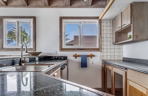 The villa boasts awe-inspiring 180-degree ocean views from a wrap-around deck and private grassy lawn, complemented by a wet bar, a fully-equipped kitchen with granite countertops and stainless steel appliances, including a 6-burner gas stove and oven. Four bedrooms each with plush California king mattresses and two bathrooms across the first and second stories ensure a restful stay. Additionally, 2 bedrooms are furnished with flat-screen TVs. The villa comfortably accommodates up to 8 guests.