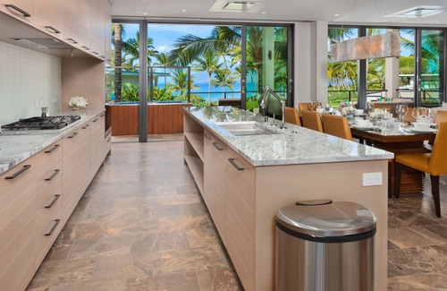 The kitchen is generously equipped as if it was in a private home. We are famous for providing everything needed for true gourmet cooking, fine dining and entertaining. You have use of a wide array of cooking, dining and serving inventory for 8 guests, dual coffee makers, an Espresso machine, Vitamix blender, griddle, rice cooker, waffle maker, crystal barware, cook books and much, much more. Assorted varieties of local Maui roasted coffees are stocked in 8 ounce bags, fresh for each arrival with real coffee creamers, non-dairy creamer, sugar/sweetener packs and quality tea bags. We just added a large gourmet Thermador gas cooktop in December 2022.