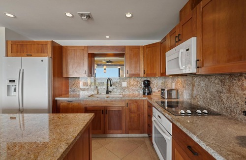 Spanning 1,510 square feet, this ground-floor condo provides a seamless indoor-outdoor living experience. The spacious living area is enhanced by sliding glass doors that open to a large outdoor lanai, perfect for relaxation and entertaining. Here, you can enjoy breathtaking views of the Pacific Ocean, watch whales during the winter months, or savor Maui’s spectacular sunsets.