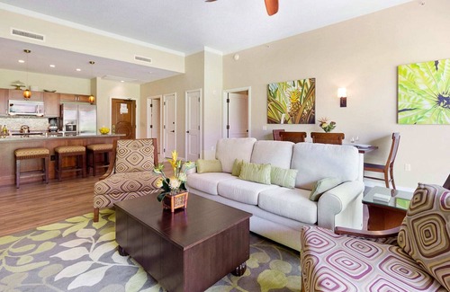 Upgraded wood grain tile flooring, elegant furnishings, custom artwork, a Blu-ray player, and upgraded bedding are all included to elevate the quality of your Maui vacation. Enjoy your favorite show or movie on the 65 inch wall mounted flat panel smart TV. Dual vanities, a walk-in shower, and a separate tub in each bath provide ample space for all guests. 11 foot high ceilings further accentuate the expansive feel of this suite.