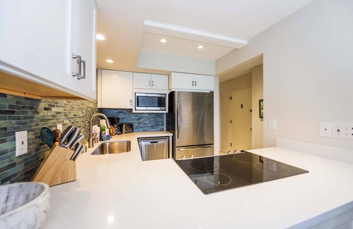 A newly renovated chef’s kitchen is fully equipped with modern stainless steel appliances, generous countertop space, and a coffee maker that accommodates both pods and cone filters. The kitchen includes high-quality cookware, glassware, stemware, and utensils to prepare and enjoy gourmet meals.